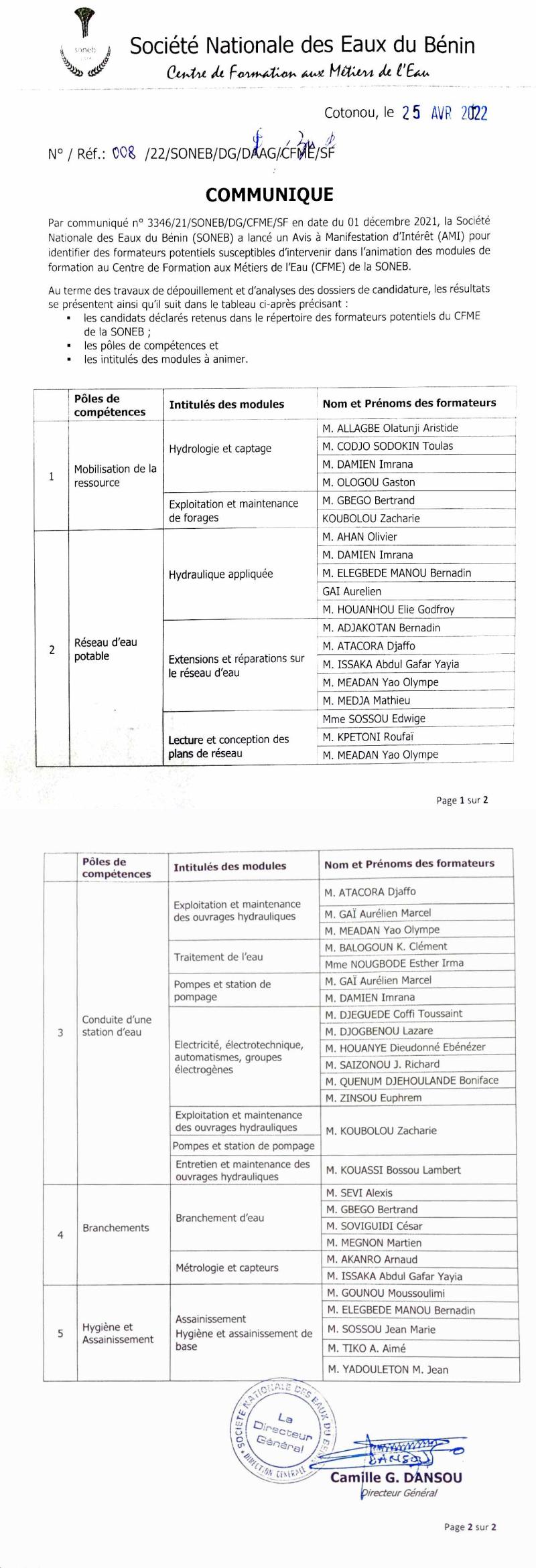 Par Communiqué n°3346/21/SONEB/DG/CFME/SF du 01 décembre 2021, la SONEB a lancé un Avis à Manifestation d'intérêt (AMI) pour identifier les formateurs potentiels susceptibles d'intervenir dans l'animation des modules de formation au Centre de Formation aux Métiers de l'Eau (CFME) de la SONEB.