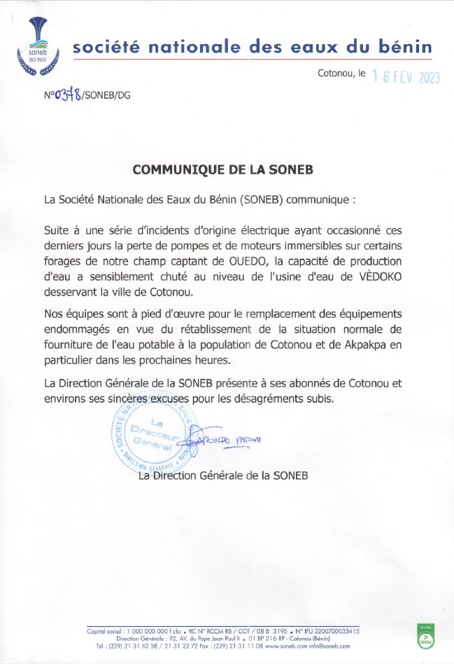Chute de capacité de production d'eau au niveau de l'usine d'eau de VEDOKO desservant la ville de Cotonou