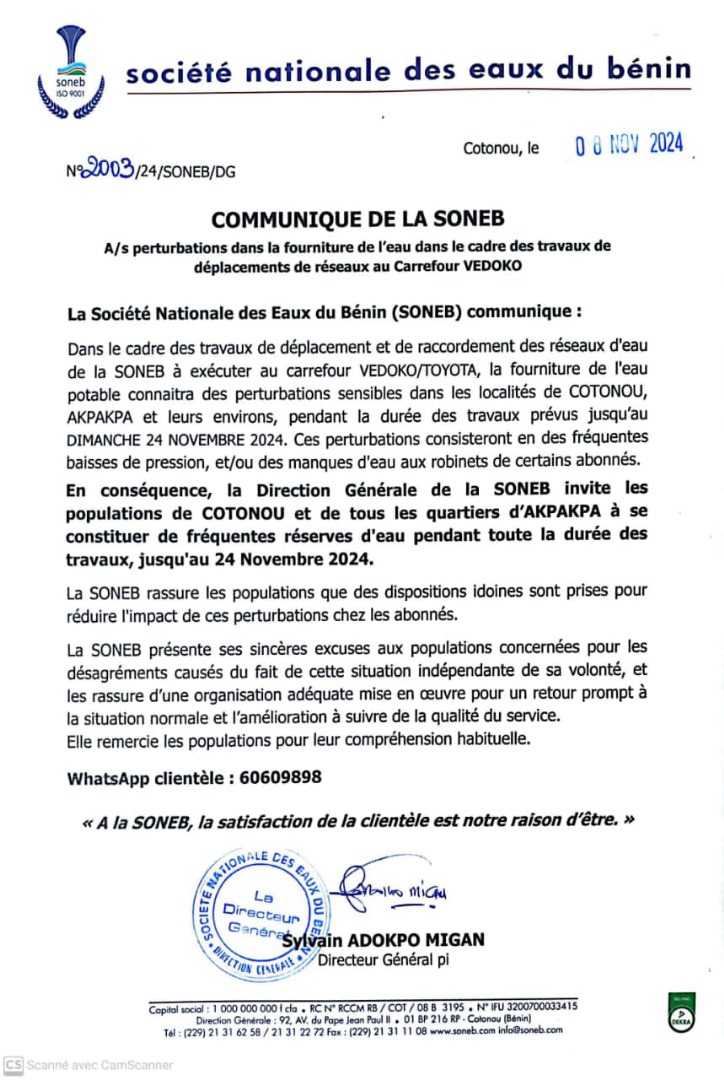 Perturbations sensibles de la fourniture de l'eau à Cotonou jusqu'au dimanche 24 Novembre 2024